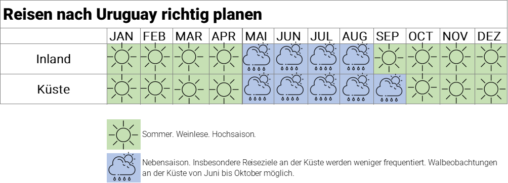 Die beliebteste Reisezeit für Uruguay sind die Sommermonate. Ab Mitte Dezember bis Ende Januar füllen sich die Badeorte an der Küste vor allem mit argentinischen und brasilianischen Touristen. Im März lockt die Weinlese in die Weinanbaugebiete. Wer den erhöhten Preisen zur Hochsaison und/oder dem Trubel an der Küste entgehen möchte, reist im Frühsommer oder Herbst. Ab Mitte November ist es meist warm genug zum Baden und bis März ist es noch angenehm warm. Das Klima Uruguays kann in etwa mit dem Norditaliens oder Südfrankreichs verglichen werden. Die Tagestemperaturen erreichen im Sommer rund 30°C, im Winter etwa 15°C. Nachts kühlt es sowohl im Sommer als auch im Winter deutlich ab. Aufgrund seiner flachen Topografie ist es in Uruguay oft windig, wodurch auch schnelle Wetterwechsel möglich sind.