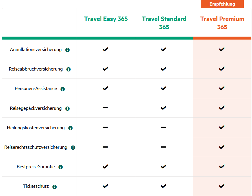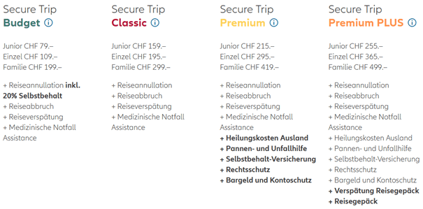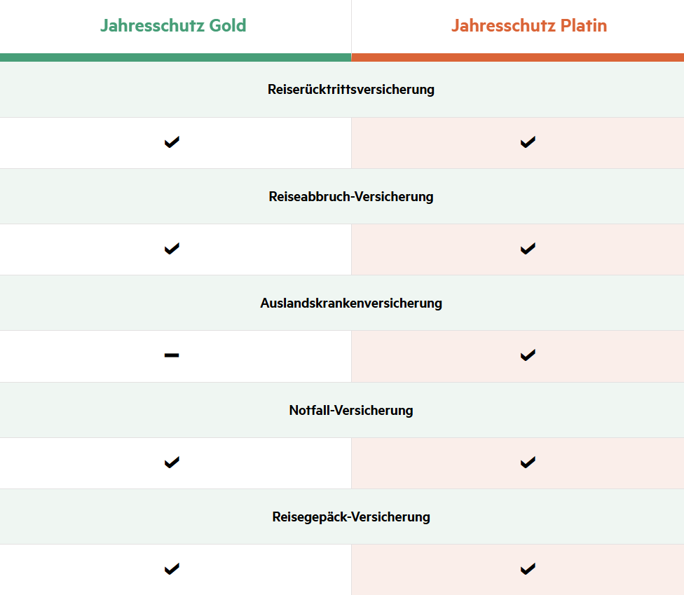 Die Allianz bietet vier Jahres-Versicherungsprodukte an, die preislich attraktiver als die Einzelversicherungen sind. Zur Auswahl stehen die Pakete Budget, Classic, Premium und Premium Plus. Wobei die Budget-Option als einziges Paket mit Selbstbehalt ist. Alle anderen Versicherungspakete sind ohne Selbstbehalt. Das Classic-Paket beinhaltet Annullierungs- und Abbruchkosten, Verspätungsschutz und Assistance. Das Premium-Paket wird um eine Pannen- und Unfallhilfe, Heilungskosten im Ausland, den Mietfahrzeug-Selbstbehaltsausschluss, Rechtsschutz, sowie Bargeld- und Kontoschutz ergänzt. Im Premium Plus-Paket ist zudem das Reisegepäck mitversichert.