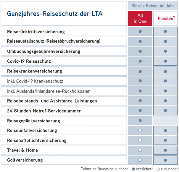 Die LTA bietet mit dem Reiseschutz All in One eine umfangreiche Jahresversicherung. Das Paket beinhaltet u.a. den Reiserücktritts- und Reiseabbruchschutz, die Reisekrankenversicherung und die Gepäckversicherung. Die Versicherung kann mit 20% Selbstbehalt oder ohne Selbstbehalt gebucht werden. Interessant ist, dass die höheren Tarife für ältere Menschen erst ab 70 Jahren angewendet werden.
