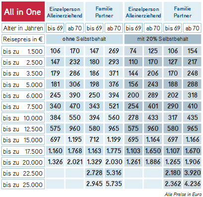 Die Preise richten sich nach den gewählten Leistungen, dem Reisepreis und Ihrem Alter. Die Versicherung wird für eine Einzelperson oder für eine Familie gebucht. Wobei als Familie bereits ein Paar (auch ohne Kinder) gezählt wird.